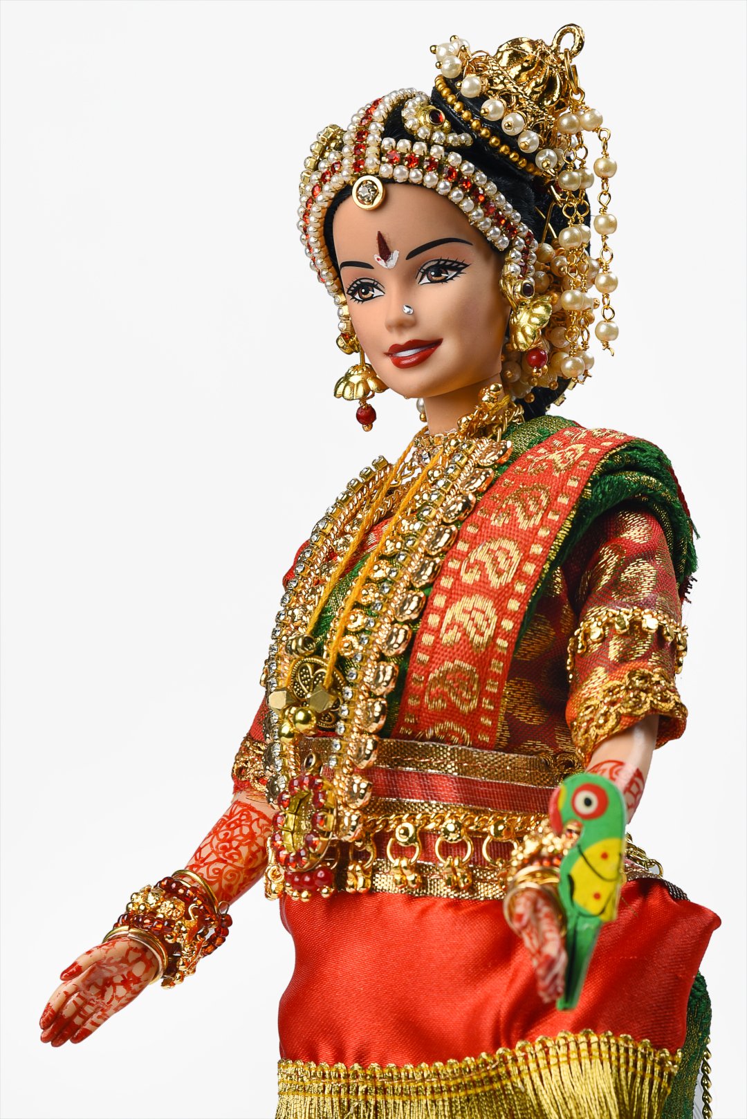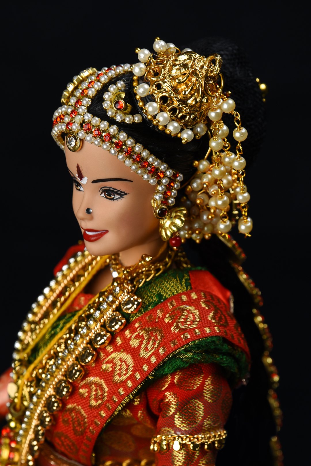 With delicate gold coins aligning a gold chain and an intricately carved gold pendant at its centre, the ‘Kilikasu Haram’ is an eye-catching neck accessory that is usually layered with other neckpieces worn by the bride. The second necklace worn by our stunning Iyengar bride doll is the Kilikasu haram (‘haram’ means necklace).