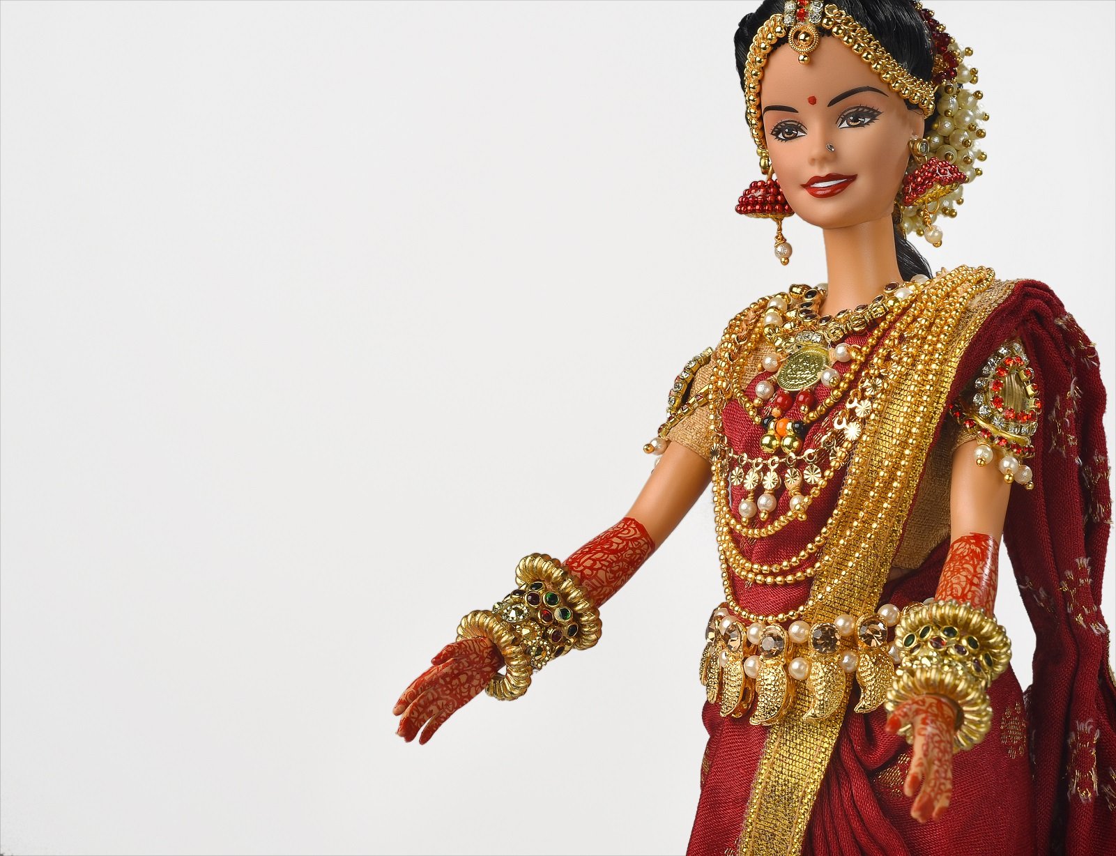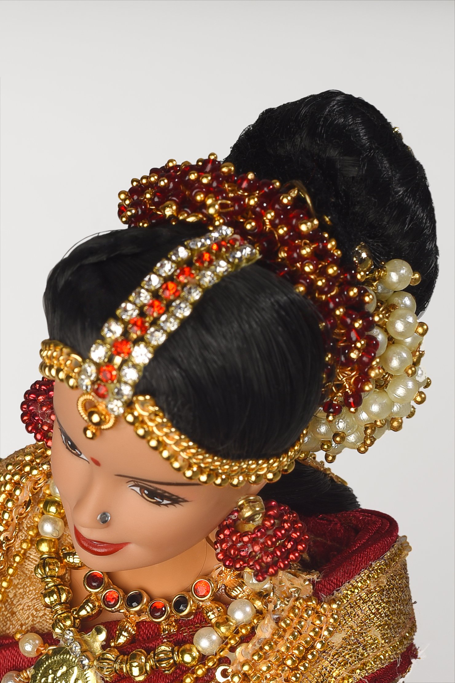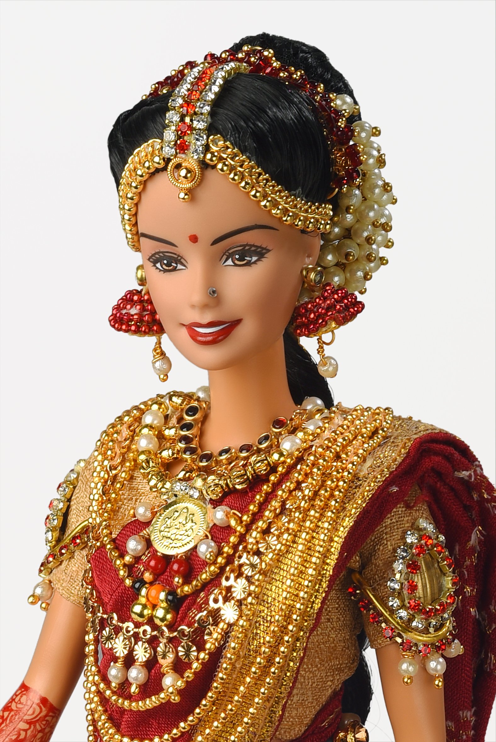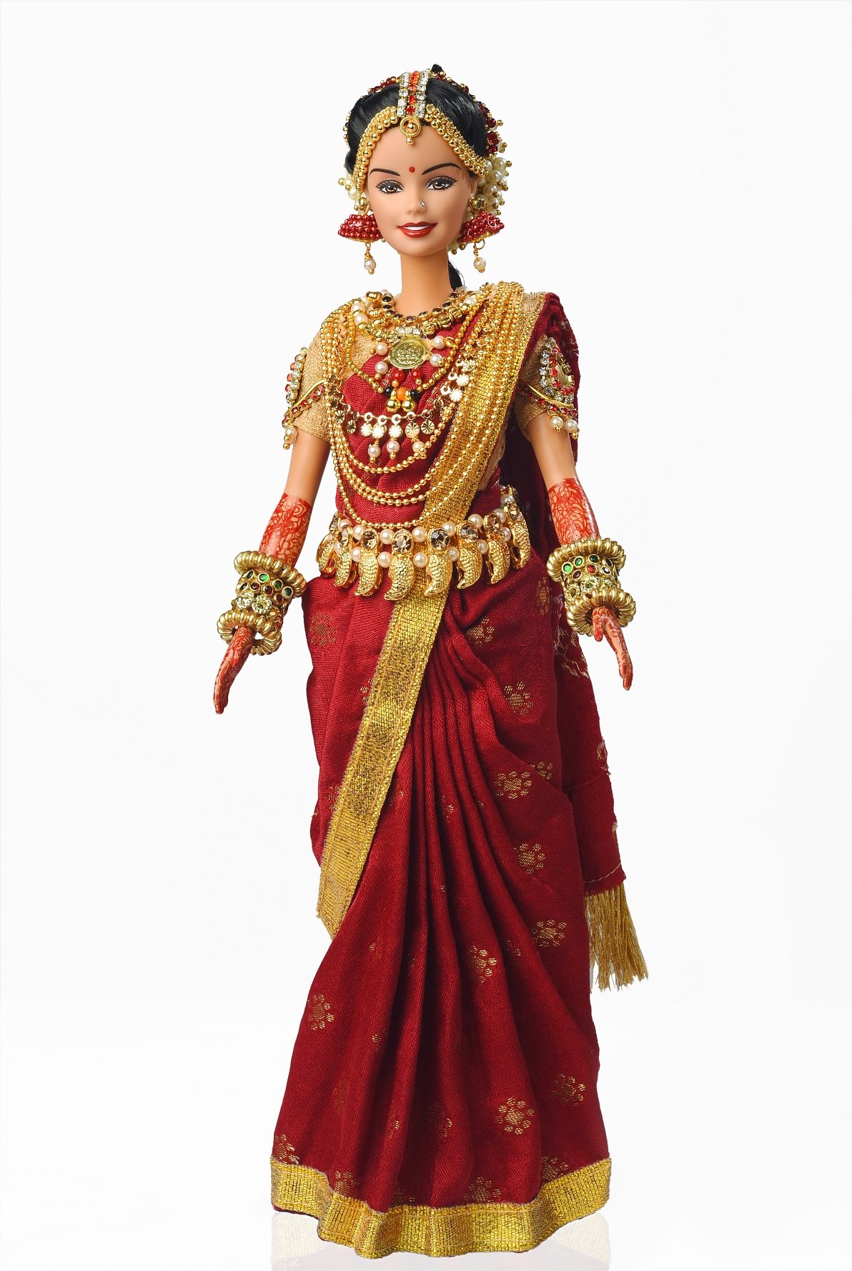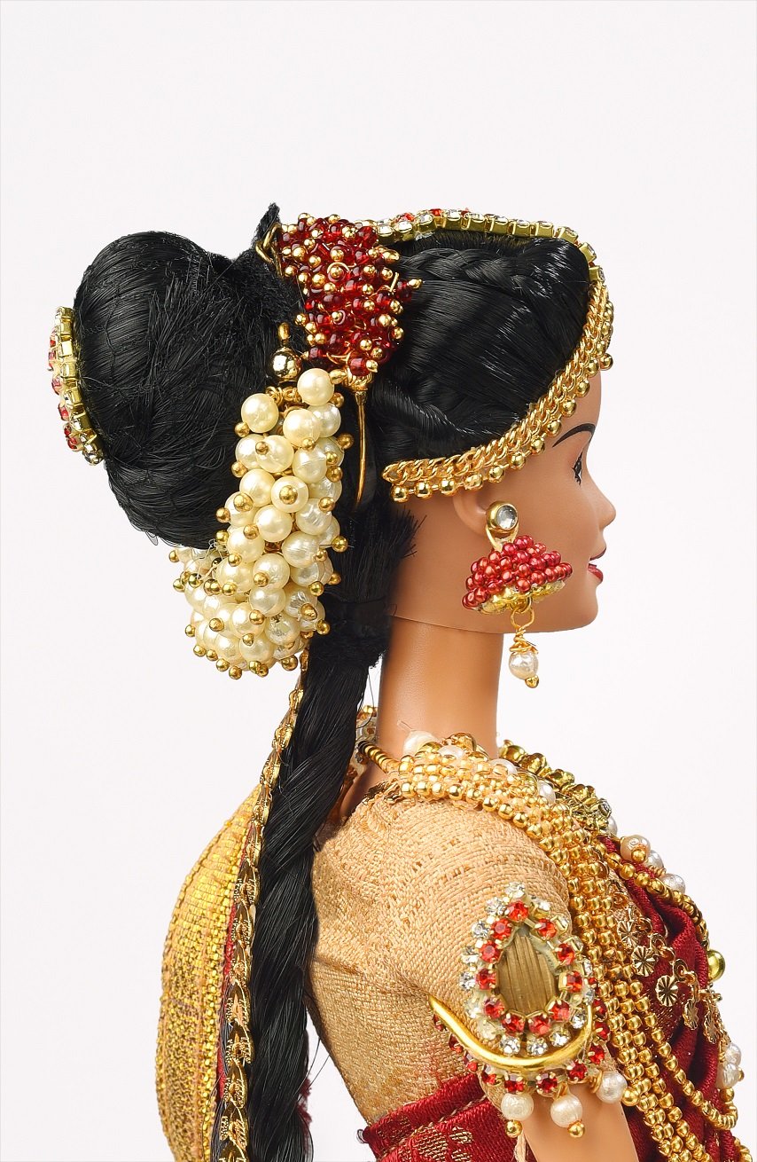 Weddings are an opulent affair in India, and are celebrated with grandeur and great joy. Jewellery forms the most important part of an Indian bride’s trousseau. South Indian brides are a symbol of beauty, pride and elegance! They revel in their love for gold temple jewelry. The state of Karnataka in Southern India is one India’s most culturally rich and diverse states with Kannada as its state language. Kannada speaking people are called Kannadigas. Let’s have a look at quintessentially Kannadiga wedding jewellery that our bride doll is wearing.