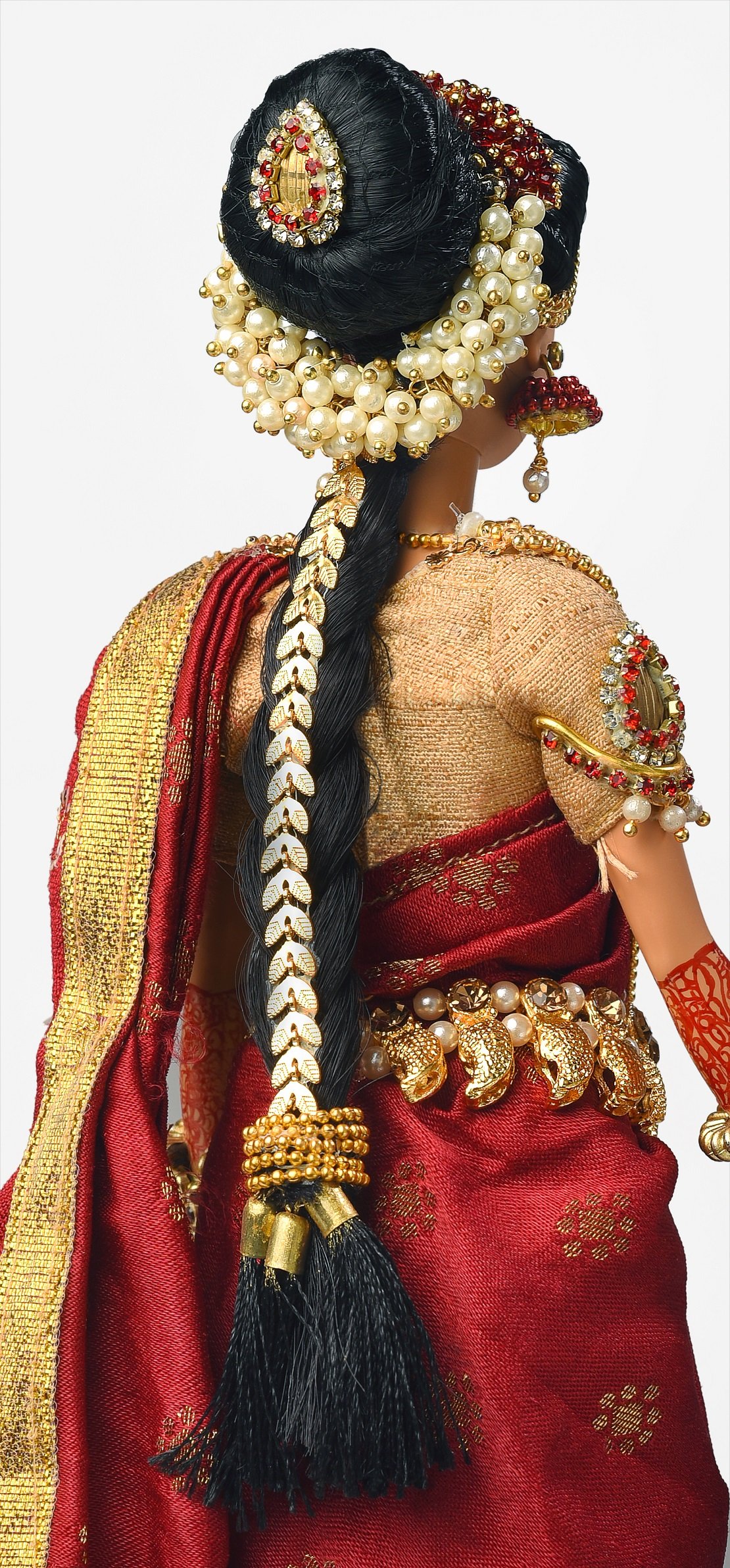 The bride’s is tied in a neat bun that extends into a long braid. The hair bun is adorned with flowers and bun pins while the braid is adorned with a long snake like ornament called Jadanagam or Jada Bille. This piece of jewellery is either one long piece or multiple smaller pieces of gold adornments, which are placed along the length of the hair braid. The end of the braid ends with three cute gold capped black balls called Jada Kunjam.
