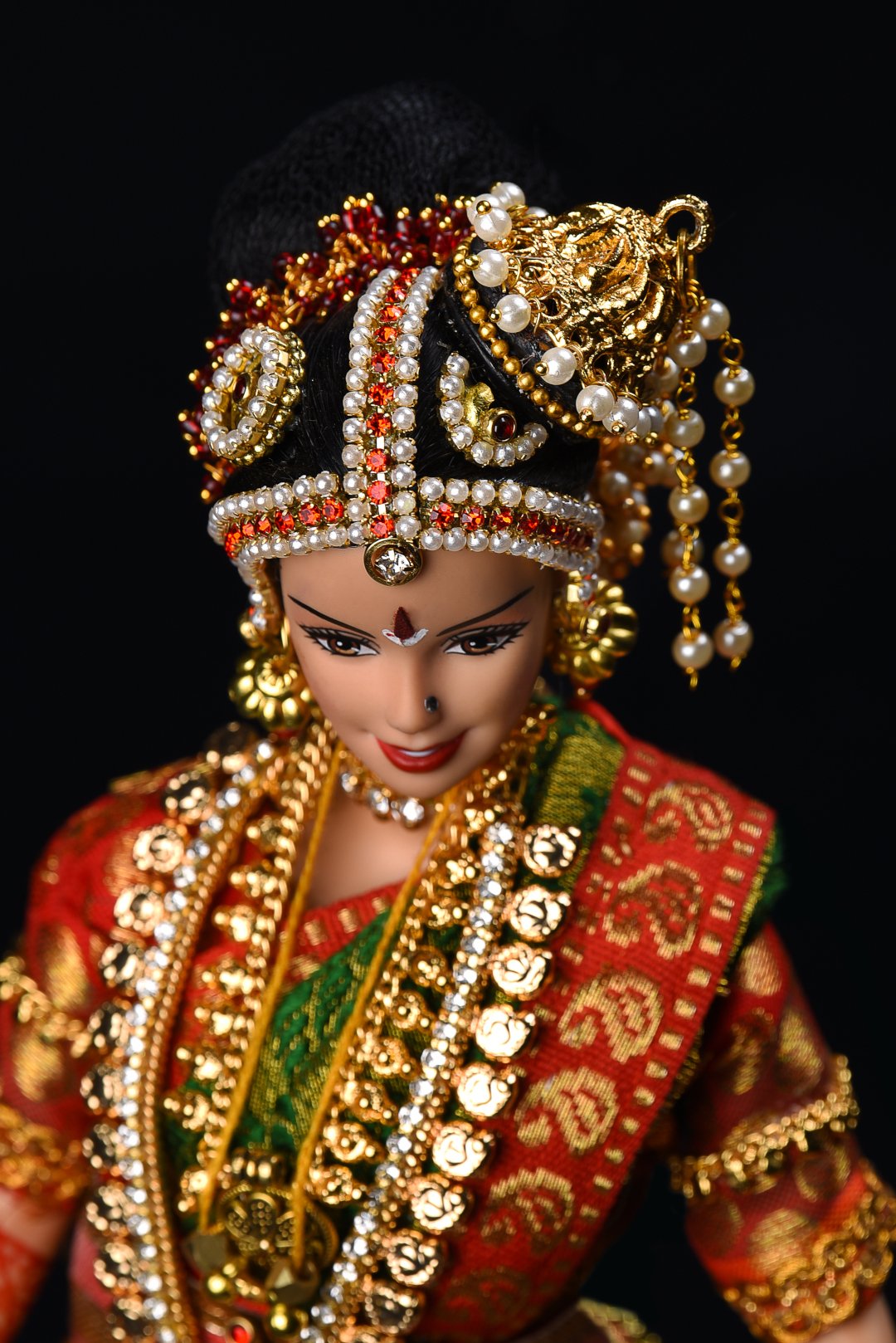 With delicate gold coins aligning a gold chain and an intricately carved gold pendant at its centre, the ‘Kilikasu Haram’ is an eye-catching neck accessory that is usually layered with other neckpieces worn by the bride. The second necklace worn by our stunning Iyengar bride doll is the Kilikasu haram (‘haram’ means necklace).